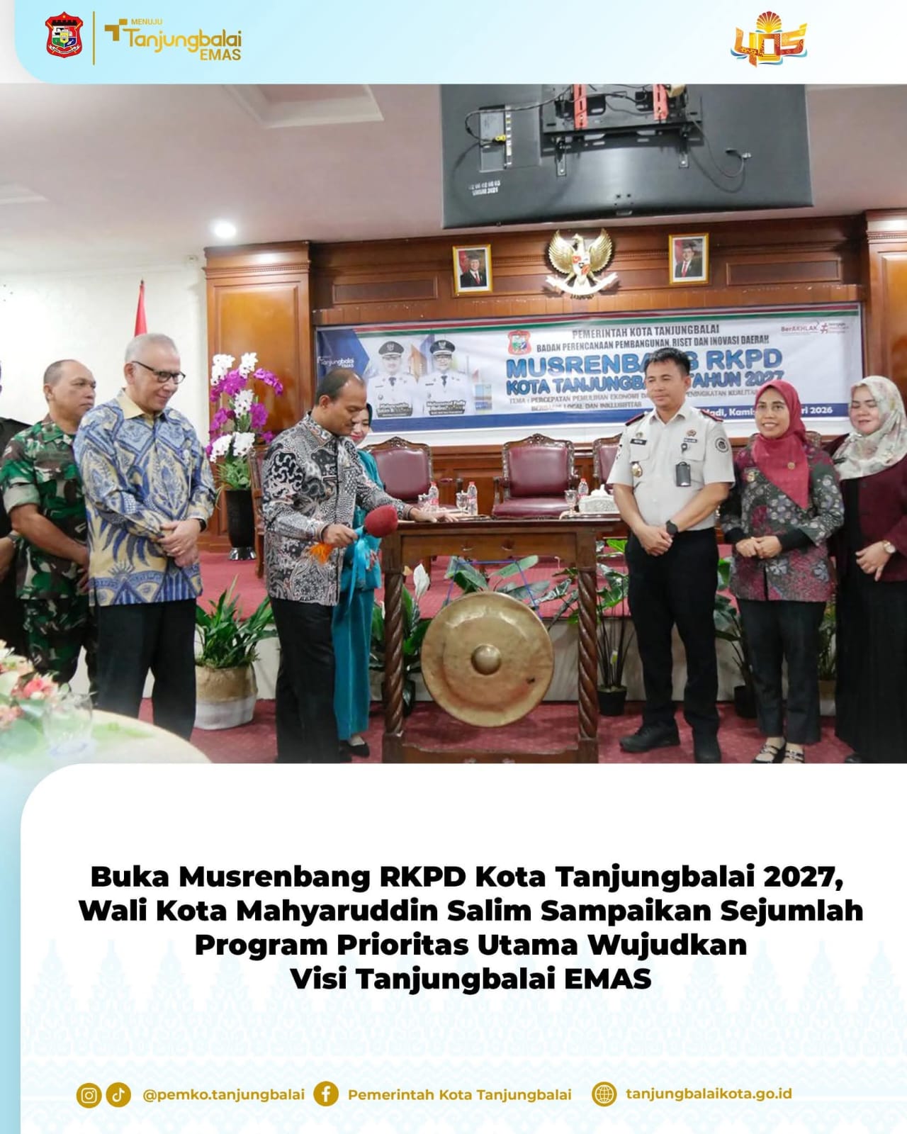 Pemerintah Kota Tanjungbalai melalui Badan Perencanaan Pembangunan, Riset dan Inovasi Daerah (Bapperida) menggelar Musyawarah Perencanaan Pembangunan Rencana Kerja Pemerintah Daerah (Musrenbang RKPD) tahun 2027 yang dilaksanakan di Aula Sutrisno Hadi, Kantor Wali Kota Tanjungbalai, Kamis (12/02/2026).