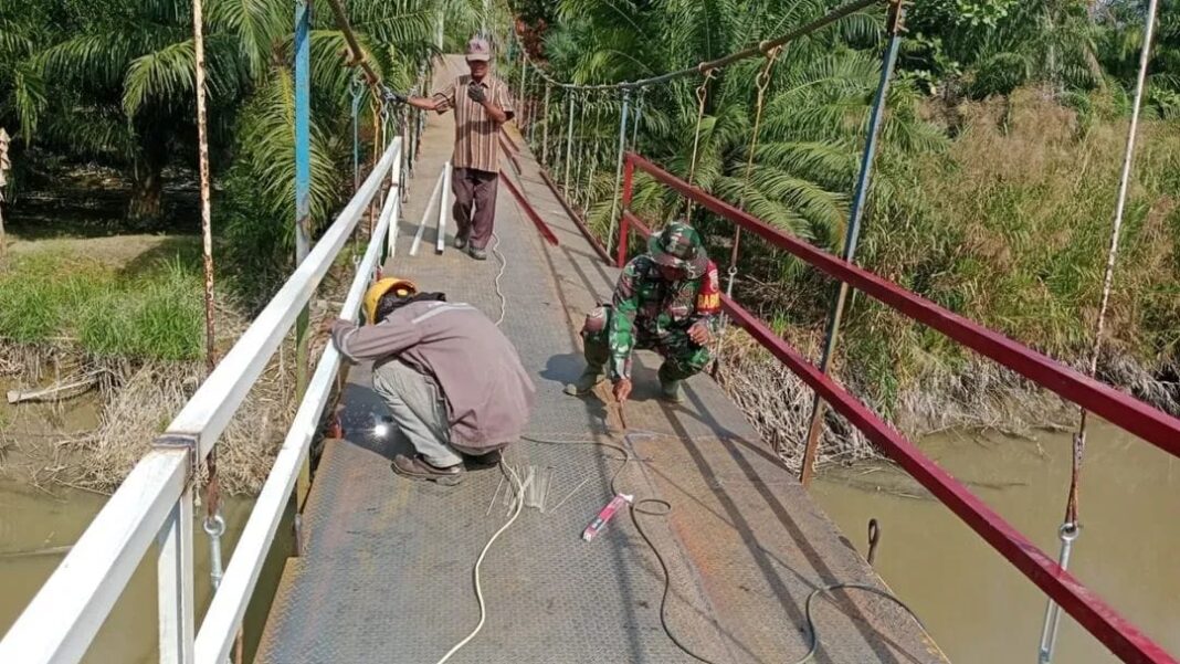 Kodim 0208/Asahan melalui personel Koramil 01/MD bekerja bersama masyarakat setempat dalam proses perbaikan. Sinergi TNI dan warga difokuskan pada pemulihan konstruksi agar jembatan kembali aman, kuat, dan layak digunakan sebagai akses utama masyarakat.
