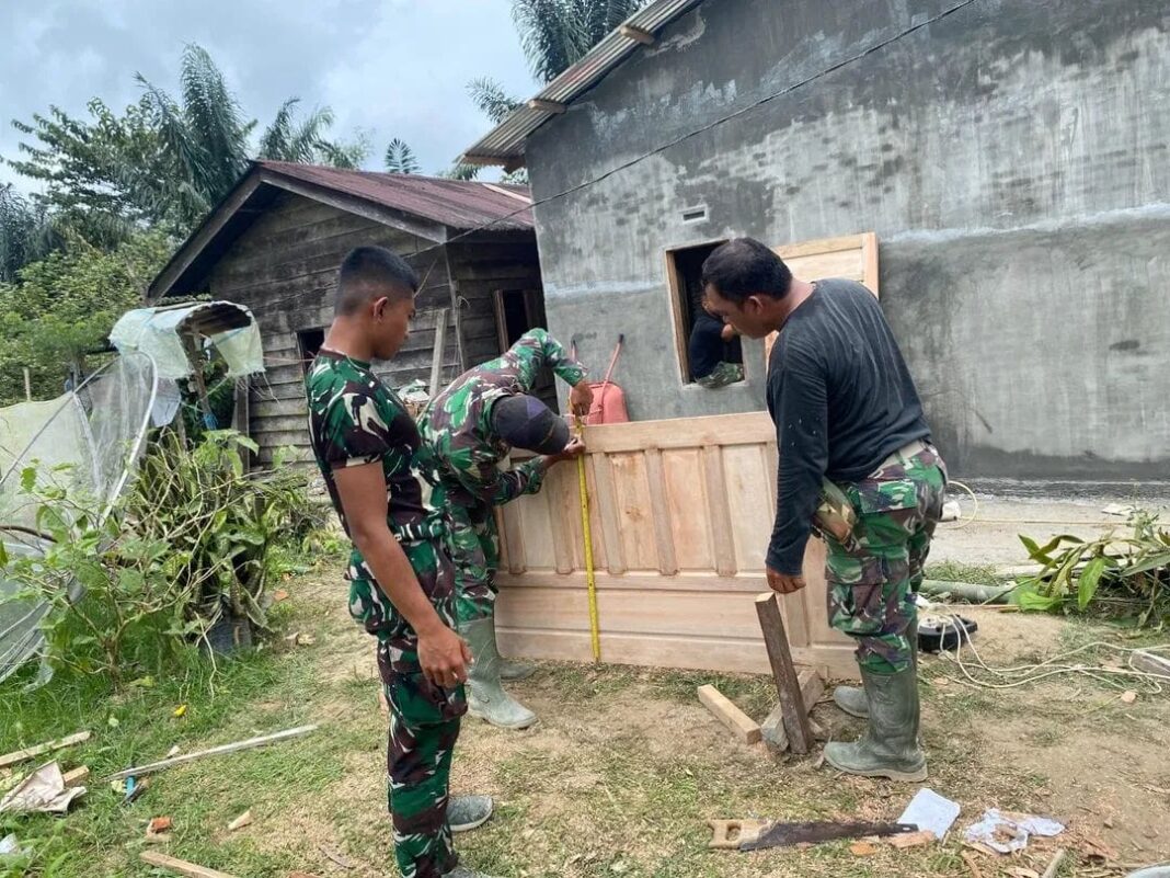 Progres pembangunan rumah kini telah memasuki tahap penting. Personel Satgas TMMD bersama warga terlihat melakukan pemasangan atap rumah, plaster dinding, serta pemasangan pintu dan jendela agar bangunan semakin kokoh dan siap dihuni.