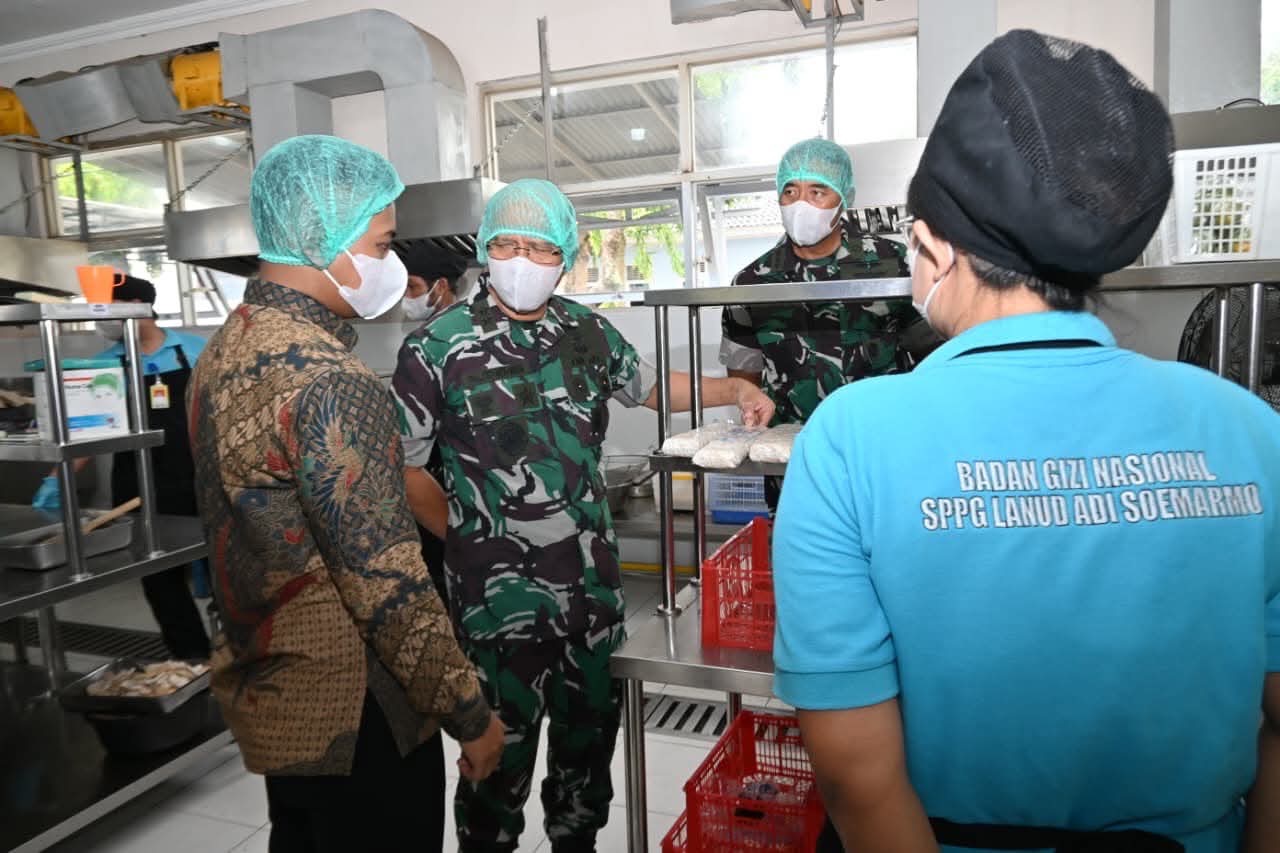 Aster Kasau di dampingi oleh Komandan Lanud Adi Soemarmo Marsma TNI Henri Ahmad Badawi, S.M., M.M., M.Han., dan pejabat Lanud Adi Soemarmo meninjau fasilitas dan proses penyiapan makanan yang di siapkan oleh SPPG Lanud Adi Soemarmo untuk di distribusikan ke sekolah sekolah penerima manfaat. Dalam kesempatan tersebut Aster Kasau juga bertatap muka langsung dengan para karyawan serta memberikan arahan kepada para karyawan yang menyiapkan bahan makanan untuk program makan bergizi gratis supaya selalu menjaga kebersihan agar makanan yang di sajikan sehat dan aman dikonsumsi.