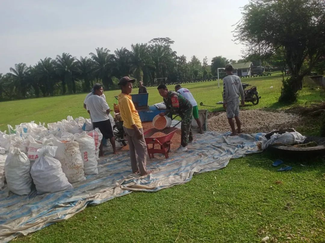Babinsa Tanah Jawa ini terlihat bekerja bersama petani, termasuk Munadi, yang sedang mengolah hasil panen jagung. Kegiatan berlangsung dengan suasana akrab, di mana kerja sama antara TNI dan warga terlihat kuat melalui interaksi yang hangat.