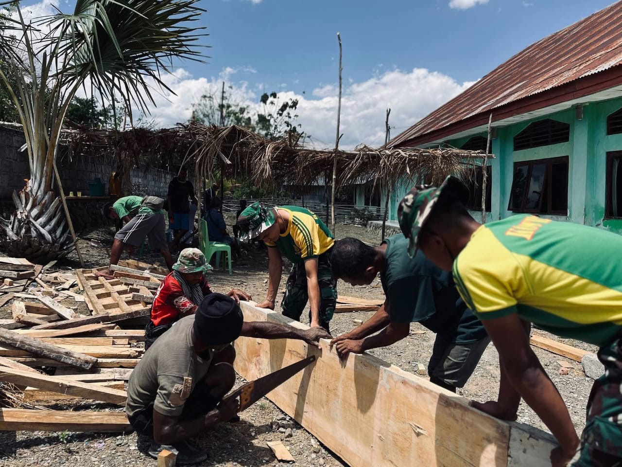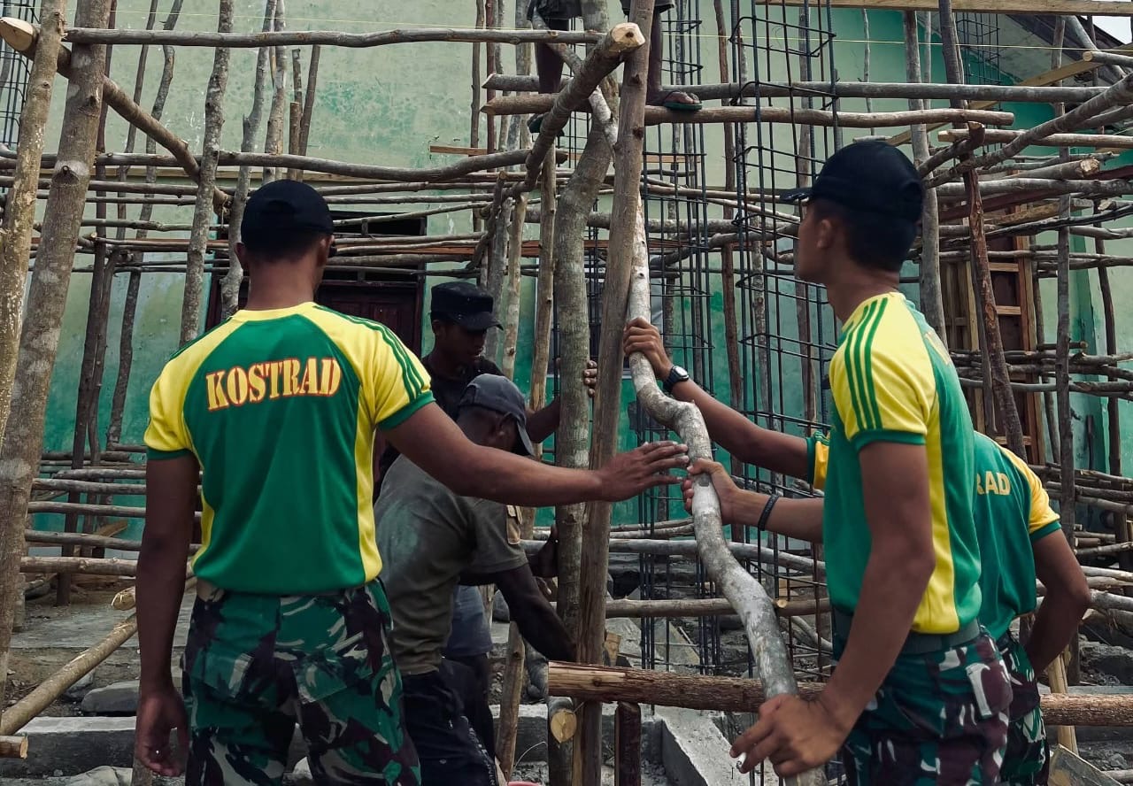 Prajurit Satgas Pamtas RI-RDTL Sektor Barat Yonarhanud 2 Kostrad Pos Oepoli Sungai melaksanakan kegiatan Karya Bakti bersama masyarakat di Gereja Talitakum Taloi, Desa Netemnanu, Kecamatan Amfoang Timur, Kabupaten Kupang.