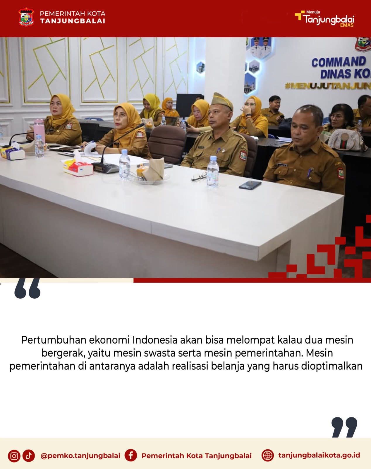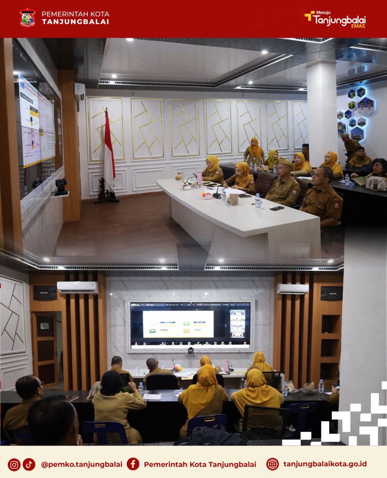 Sekretaris Daerah, Nurmalini Marpaung didampingi Asisten Ekbang drh Muslim, Kadis Koperasi dan UKM Agus Salim dan Plt. Kadis Dagper Wiwi Fitria, mengikuti Rapat Koordinasi (Rakor) Pengendalian Inflasi Tahun 2025 dan Percepatan Realisasi Belanja untuk Menjaga Pertumbuhan Ekonomi, yang berlangsung di Command Center Dinas Kominfo, Kantor Wali Kota Tanjungbalai, Senin (20/10/2025).