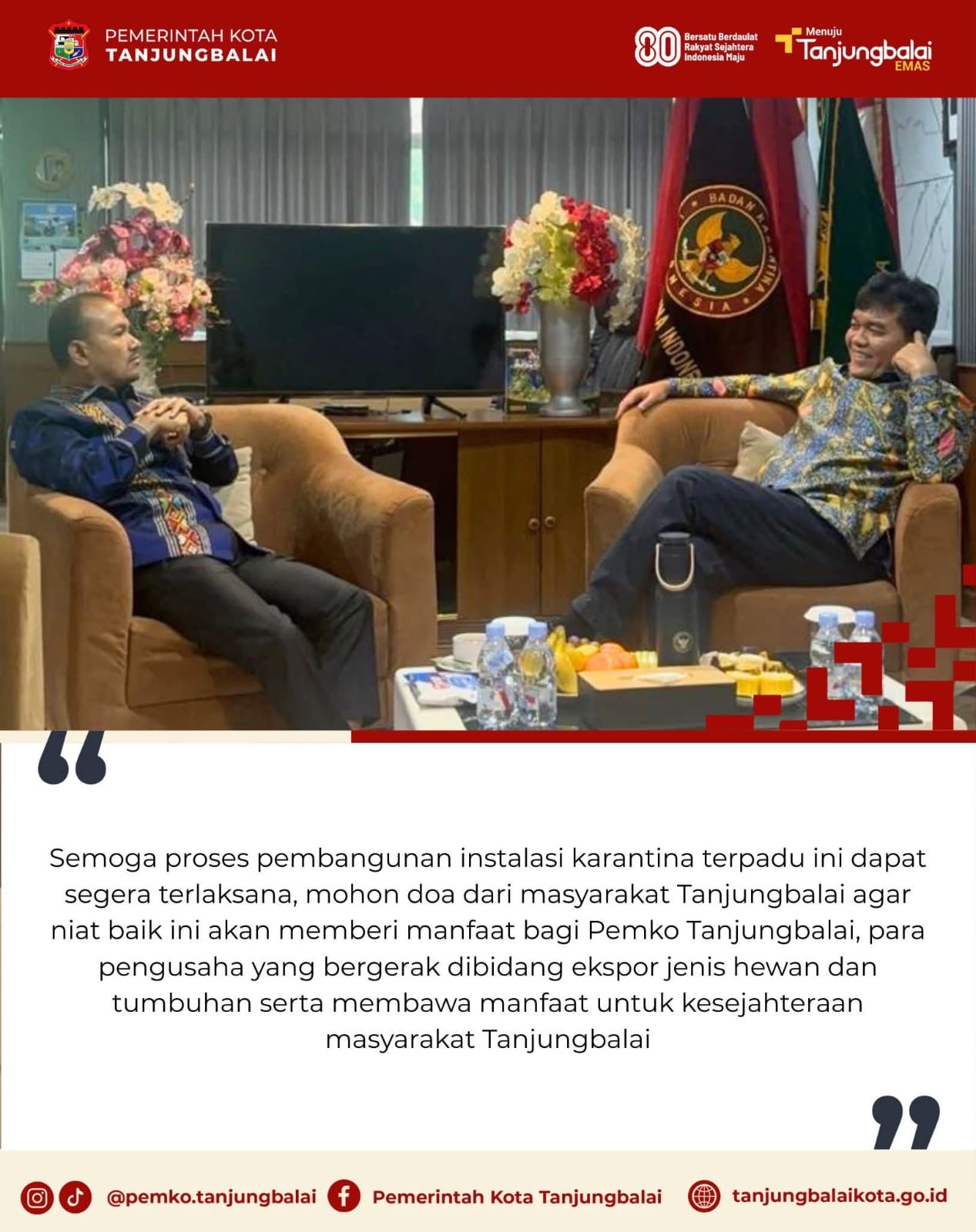 “Pertemuan ini merupakan lanjutan dari pertemuan sebelumnya yang telah dilakukan bahkan Bapak Kepala Barantin sendiri beserta jajaran telah datang langsung ke Tanjungbalai dan melihat lokasi yang akan dijadikan instalasi karantina terpadu”, ujar Wali Kota Mahyaruddin saat bertemu dengan Kepala Barantin itu.