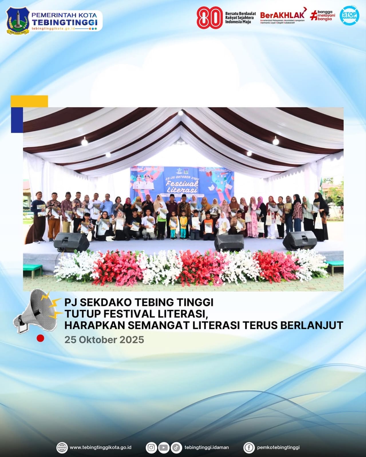 Penjabat (Pj.) Sekretaris Daerah Kota (Sekdako) Tebing Tinggi, Muhammad Syah Irwan, secara resmi menutup Festival Literasi Tahun 2025 di Tanah Lapang Merdeka, Jalan Dr. Sutomo, Sabtu (25/10/2025).
