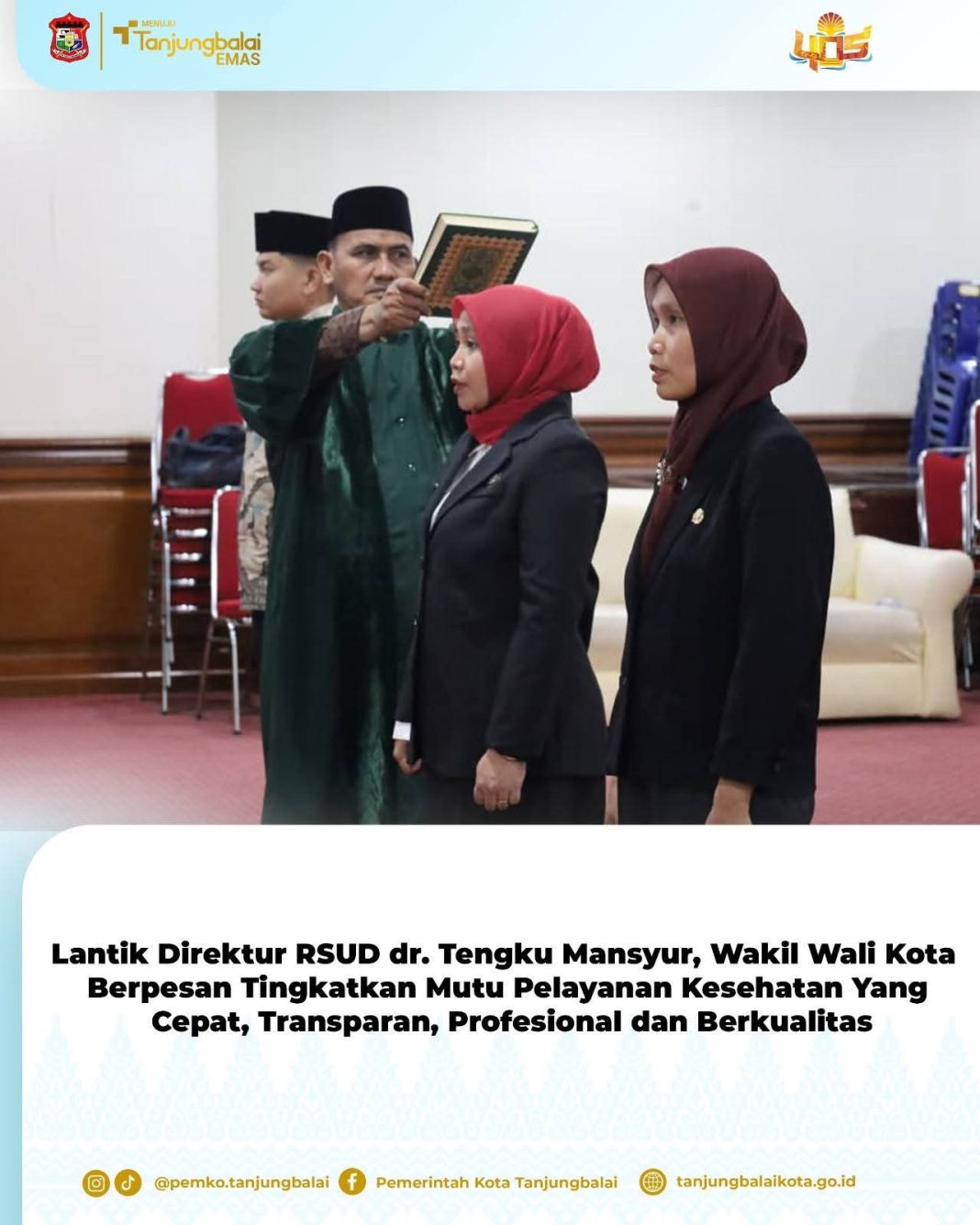 Pemerintah Kota (Pemko) Tanjungbalai melalui Wakil Wali Kota Tanjungbalai Muhammad Fadly Abdina mewakili Wali Kota Tanjungbalai melantik dan mengambil sumpah jabatan Pejabat Administrator dan Pejabat Pengawas di lingkungan Pemko Tanjungbalai, di Aula Sutrisno Hadi, Kantor Wali Kota Tanjungbalai, Kamis (8/1/2026) sore.