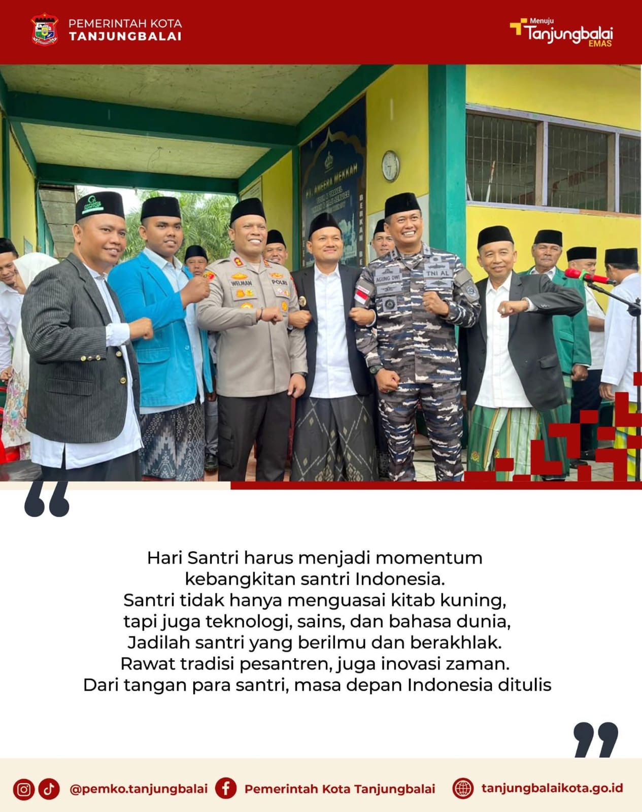 Dalam kesempatan itu, Wali Kota Mahyaruddin Salim membacakan amanat resmi Menteri Agama RI, Prof. Nasaruddin Umar, yang secara serentak dibacakan di seluruh Indonesia. Tahun ini, peringatan Hari Santri mengusung tema “Mengawal Indonesia Merdeka Menuju Peradaban Dunia”, sekaligus menandai satu dekade penetapan Hari Santri melalui Keputusan Presiden Nomor 22 Tahun 2015.